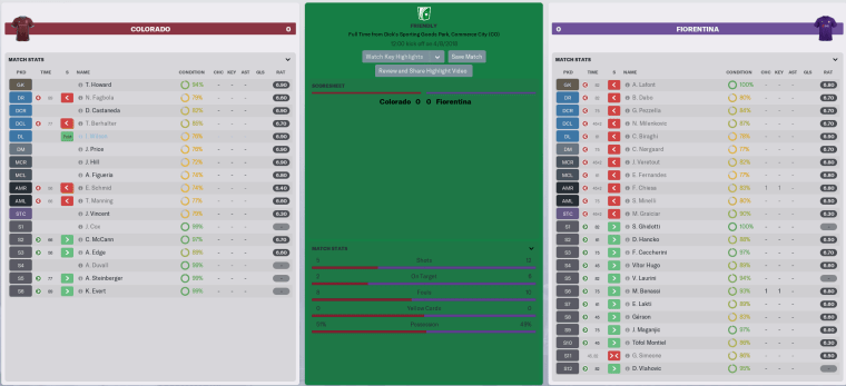 Our ‘Hero of the Day’ was Gérson, who bagged a first-half brace from the right wing, though teenage holding midfielder Abdou Diakhaté made a name for himself with two assists. Maximiliano Olivera was less impressive in giving away a penalty, which reduced our lead to 2-1. Marco Benassi quickly restored our cushion before Valentin Eysseric completed a winning start to my Viola career. “YEAAAAAAH!”