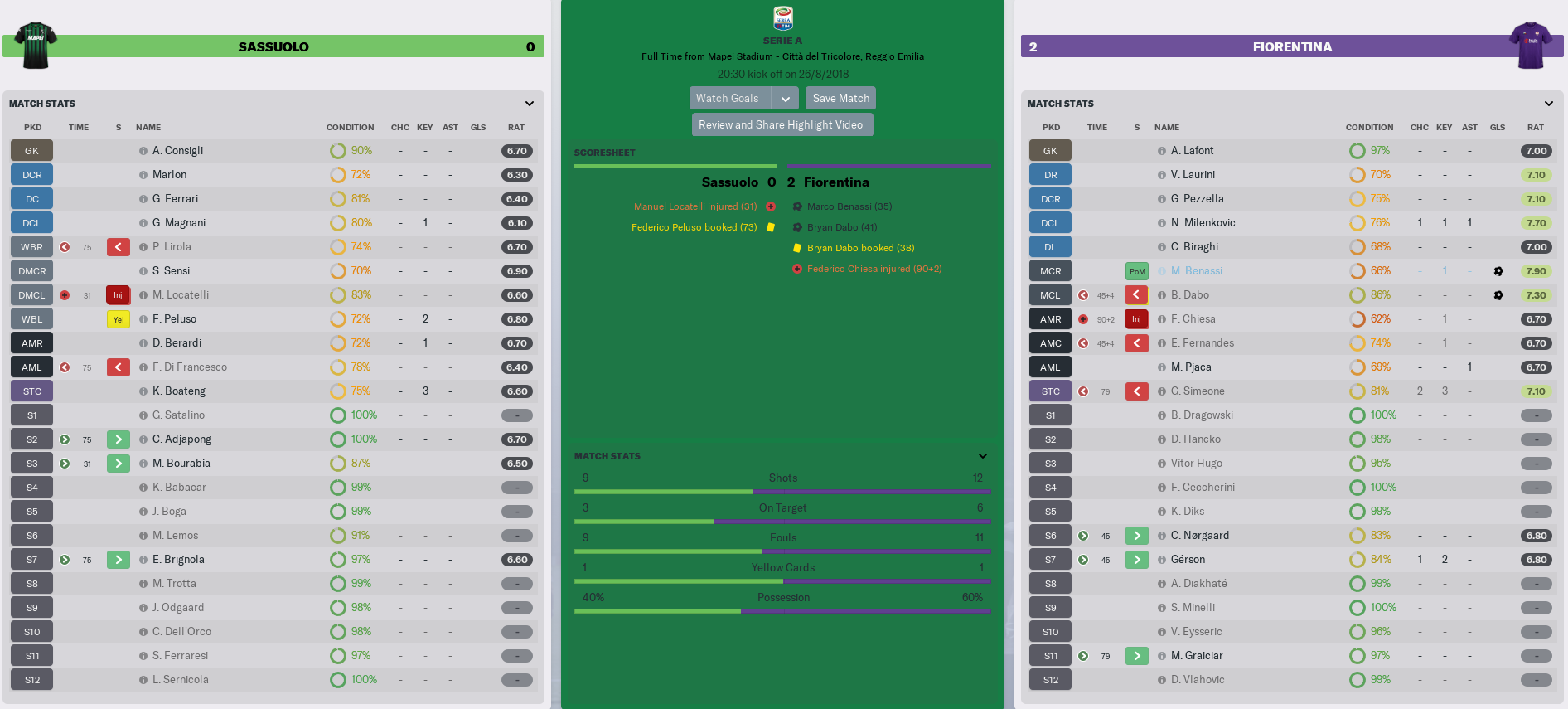 Sassuolo were beginning their sixth season in Serie A, having recently established themselves as a lower-mid-table side. They deserved the utmost respect, but I was still confident enough in getting a result to test out the 4-2-3-1 in competitive action for the first time.
