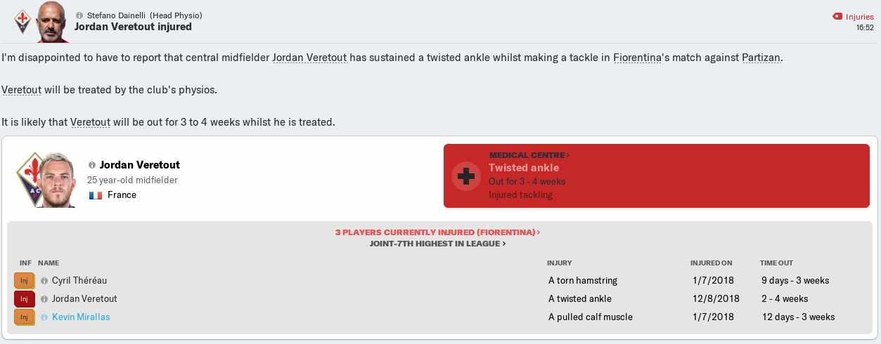 That looks pretty bad, but remember that Veretout already has to serve a two-match suspension against Milan and Sassuolo. This injury simply means he will also miss a third game – at home to Udinese before the international break.