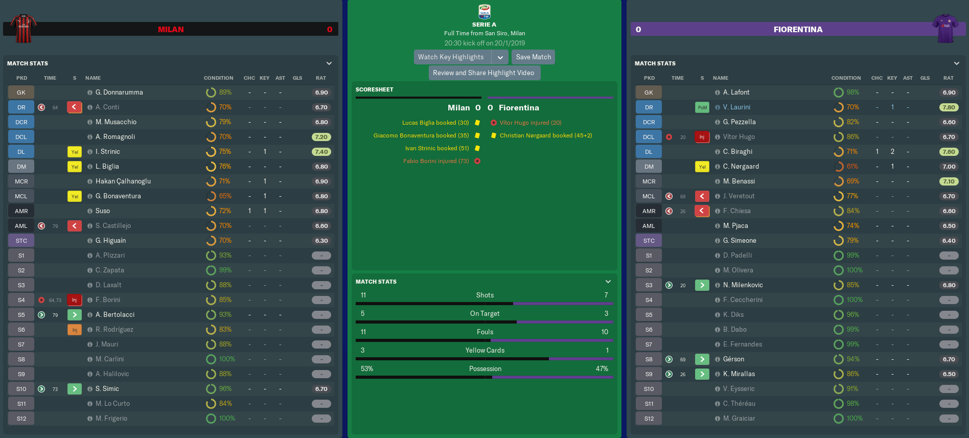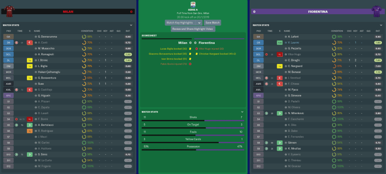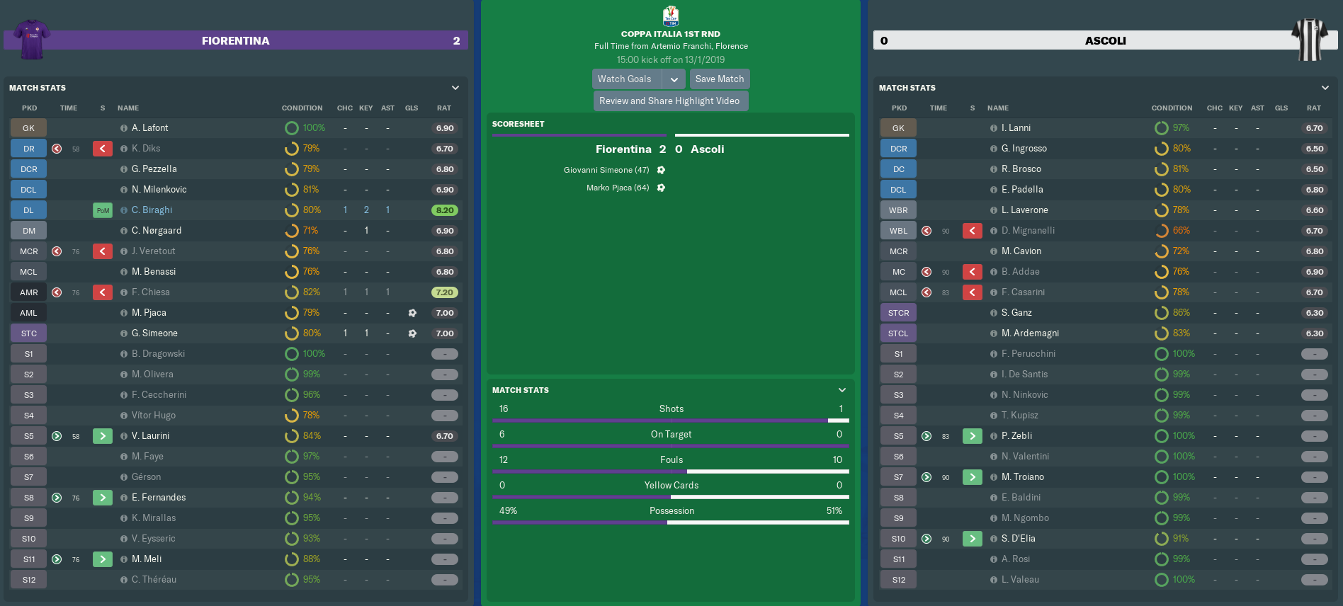 With both teams having been noticeably weakened, the quality dipped and a 0-0 draw soon looked inevitable. This was my first competitive game as Fiorentina boss that finished goalless.