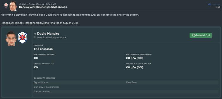 Hancko is only our third-choice in his position, so I always intended to loan the young Slovakian out in this window. I suppose I could’ve found worse destinations for him than a mid-table club in the Primeira Liga.