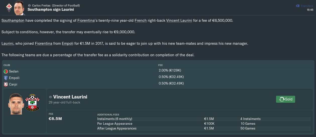 With Touré arriving in the summer, Laurini’s Fiorentina days had been numbered, but I didn’t mind selling him now. Diks deserved an extended run in the starting line-up after maturing over recent months, while Gilberto would now stick around to provide cover for our flying Dutchman. Everything’s going to be just fine.