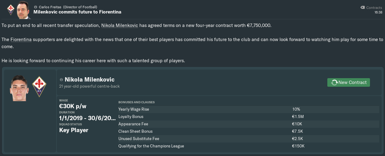Also, another Fiorentina player has committed his long-term future to the club. I don’t actually see Nikola Milenkovic as a key player just yet, but his agent basically backed me into a corner regarding the Serbian’s squad status. At the rate he’s developing, though, he’ll surely become indispensable before too long.