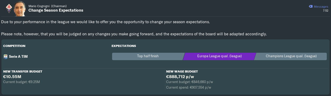 Speaking of my budgets, this message popped up just before the fortnight-long transfer frenzy (yes, the January window really is that short in Italy now). I had to adjust my league expectations to eke out a little more money, but after the start we’d enjoyed, a top-six finish in Serie A was now the absolute minimum.