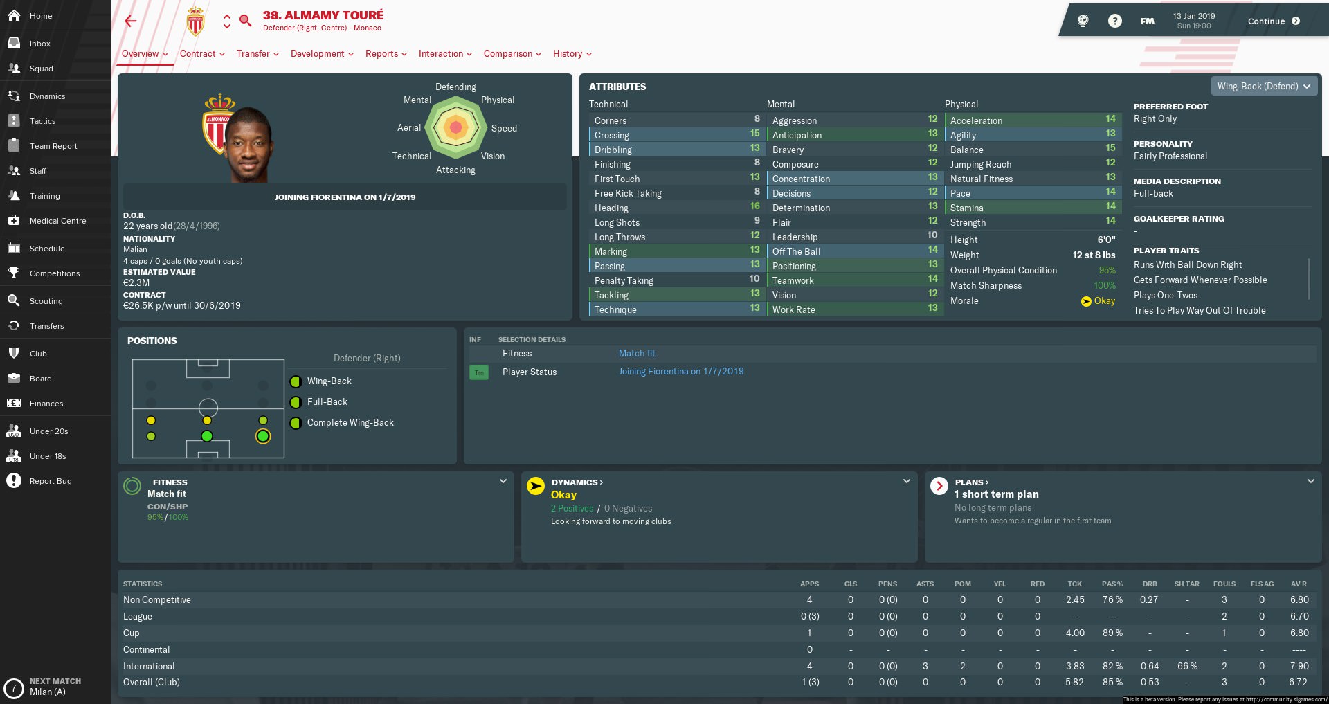 Attacking wing-back Almamy Touré was a Ligue 1 winner with Monaco in 2017, when he was just 21. Touré had since fallen out of favour in the principality, and with his contract set to expire, I wasted little time in getting him to sign a pre-contract agreement with us. Touré officially becomes a Viola player next season.