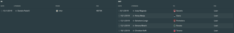 Meanwhile, five young players went out on loan, with Simone Minelli being the most high-profile. Minelli made a couple of league appearances for us but hadn’t developed as well as I’d hoped, so the forward’s latest loan move to Renate in Serie C is pretty much his last chance. If he doesn’t impress, he might leave for good in the summer.