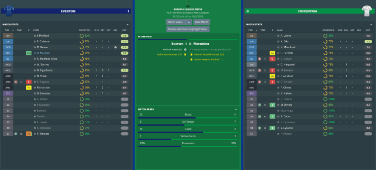 One of our Nikolas was luckless on 68 minutes, with Kalinic cannoning an Eysseric free-kick against the bar before Toffees captain Seamus Coleman cleared. Namesake Nikola Milenkovic had our last opportunity three minutes from time, beating Simeone to Jordan Veretout‘s outswinging corner. Pickford was once again determined not to be beaten, and so we were in our Europa League opener.