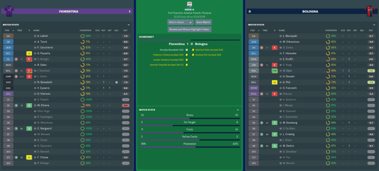We’re down in 10th, we’ve won once from five games, we’ve scored twice in seven-and-a-half hours, Fullerball has become a mess, and my players are losing faith in me. Other than that, I’d say September has been a pretty decent month for Fiorentina.
