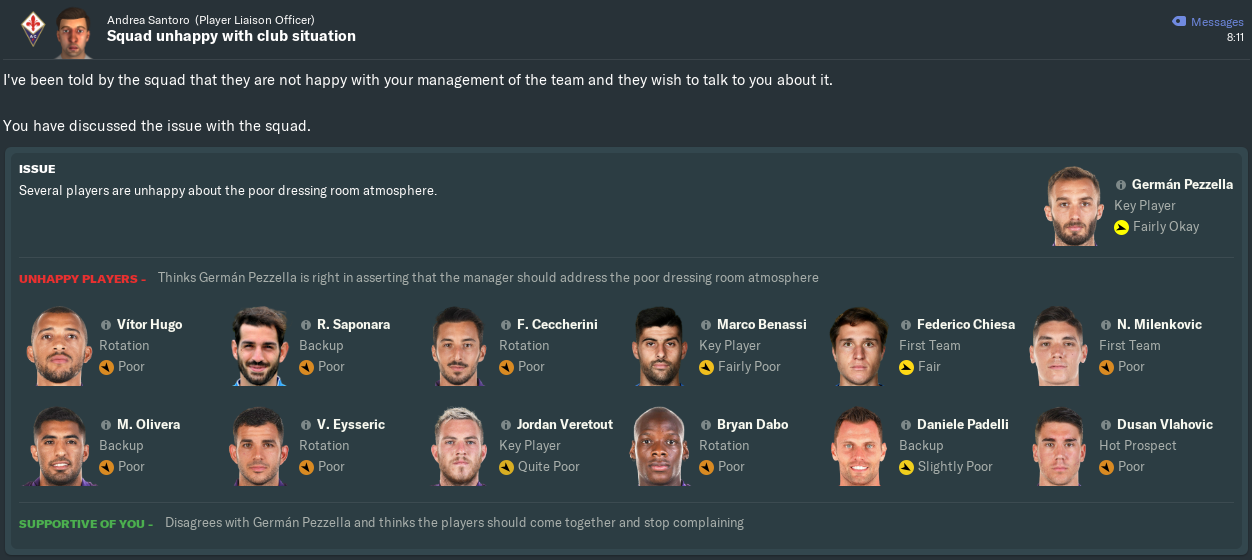 Before we closed out the month at home to Chievo, I tried to get us back on track with a team meeting. I told the lads that I had faith in them, despite recent disappointing results, and… erm, I pretty much wrecked squad morale. The next day, Germán Pezzella and another dozen concerned players demanded answers:
