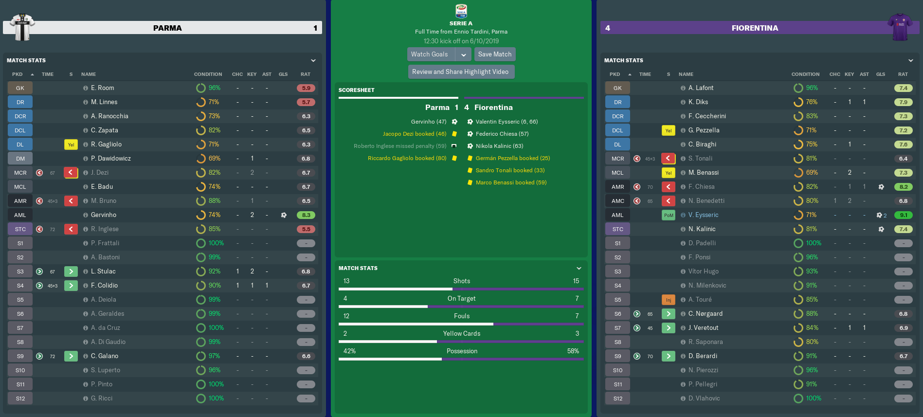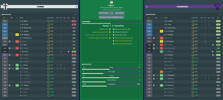 Three minutes later, Eysseric eyed up his second goal, and our fourth of the night. The in-form forward planted in a majestic header from Kevin Diks‘ cross, and my joint-biggest Serie A win as Fiorentina manager was effectively secured. 4-1 to the fabulous Viola.