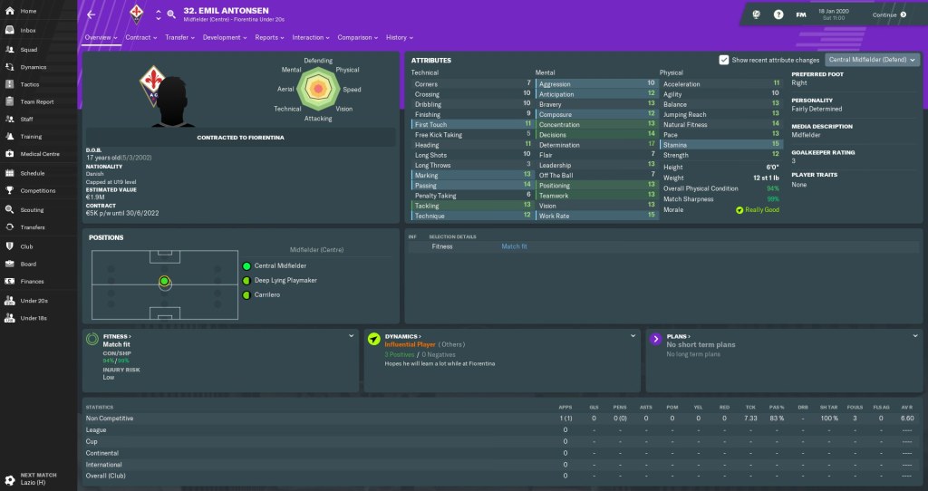First to come in was Emil Antonsen – a Denmark Under-19s international midfielder who cost us €2million (potentially rising to €3.5million) from FC København. Antonsen is very determined, very hard-working, and he looks very well-rounded for someone so young. He also has a silhouette for a face, which is probably a good indicator that I need to update my facepack.