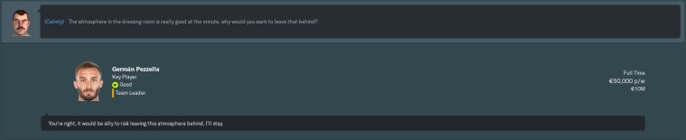 Monaco later tried to unsettle Pezzella, submitting a couple of offers for our captain in the closing stages of the European transfer window. After I rejected their final offer of €11million plus incentives, Germán demanded to know why I’d priced him out of a move. Thankfully, I quickly managed to get him back on side: