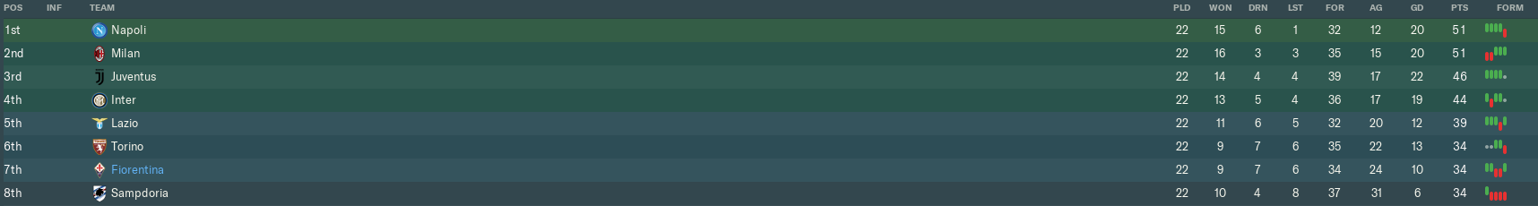 Torino and Sampdoria were each beaten by Lazio and Udinese respectively, which meant we were now in a three-way points tie for 6th. Head-to-head records put us just above Samp in 7th, but behind Torino.