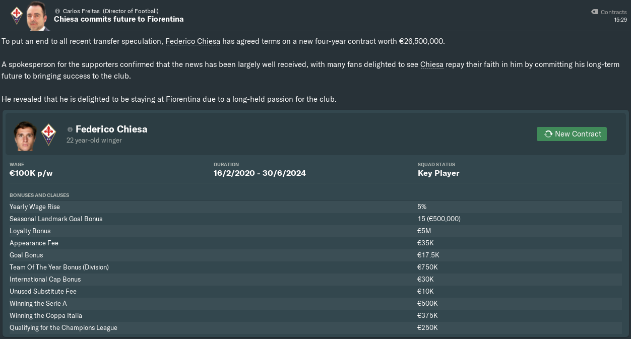 Contract negotiations with Chiesa were rather stressful, but with some incentivising, I managed to get his €140,000-per-week demands down to a more modest €100,000. That still made Federico our highest-paid player by a considerable margin, but if it’s enough to prevent our wing wizard from being lured to London or Paris, that’s the price I’ll pay.