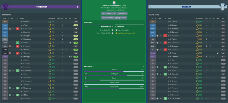 While we came into the first leg of our Coppa Italia Semi on a high, underdogs Pescara were going through an indifferent run of form. Even with reserve Daniele Padelli keeping goal for an otherwise strong Fiorentina team, I felt confident that we could brush the Delfini aside on home soil and take a strong lead into the rematch.