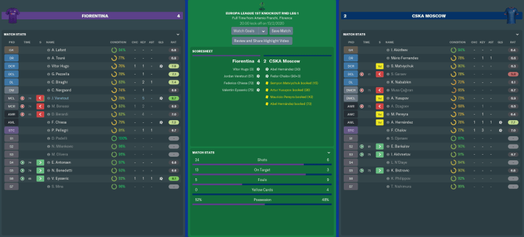 All the big guns (minus Dabo) were back in action when we continued our expedition in UEFA’s Thursday tournament. CSKA Moscow arrived in Florence as formidable opposition, so a home victory was of paramount performance to us before the rematch in Russia.