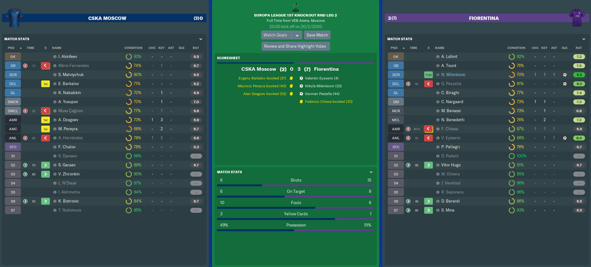 CSKA MOSCOW vs FIORENTINA (Europa League, Round of 32 – Leg 2)