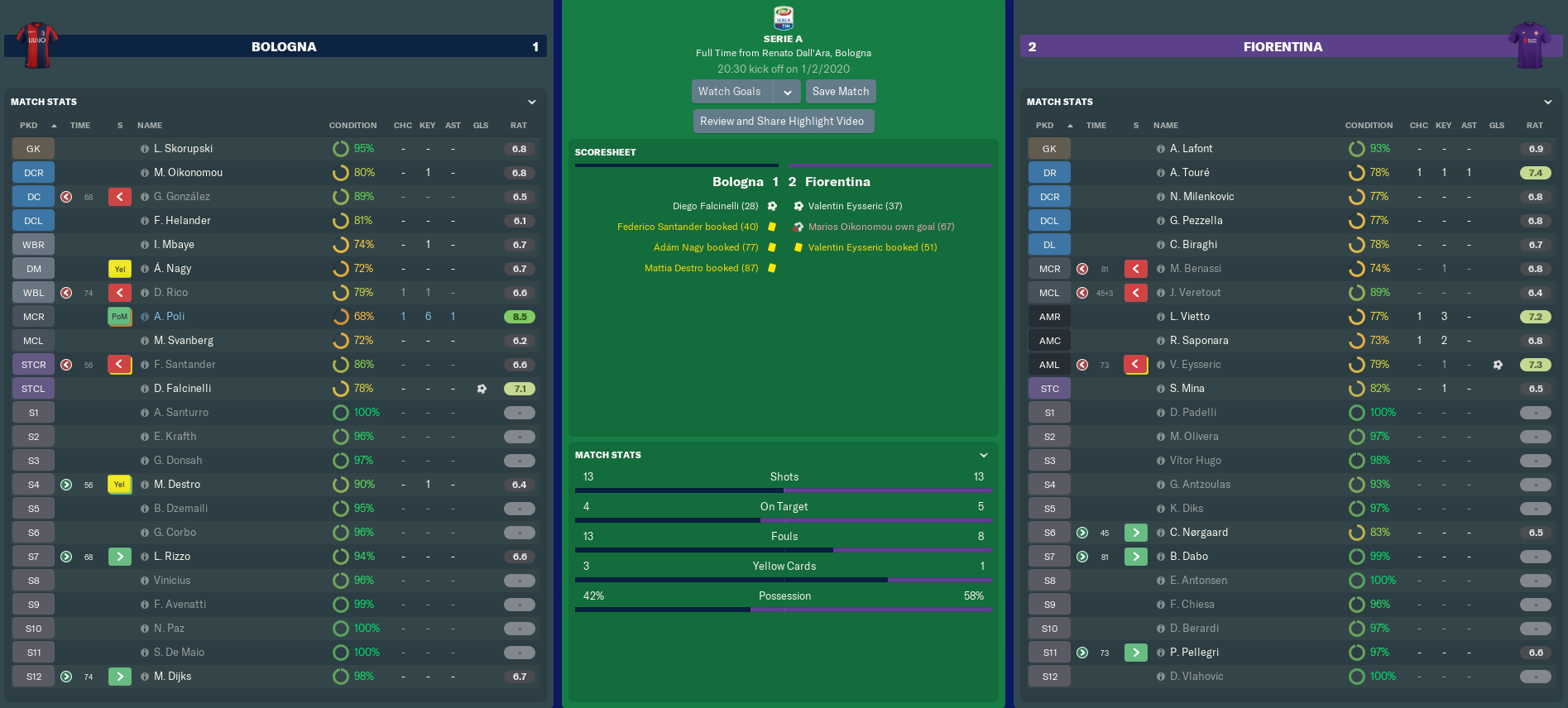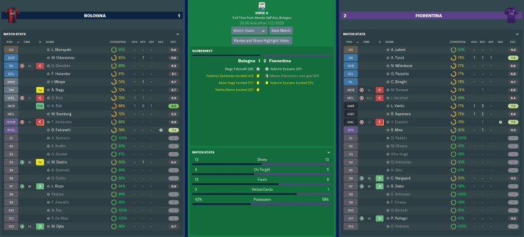 It was the defence that I was most disappointed with, particularly in the 28th minute. Centre-half Nikola Milenkovic could not intercept Bologna midfielder Andrea Poli’s searching ball to Diego Falcinelli, allowing the one-time Viola flop to slam in the opener. The referee needed to check with VAR before confirming the goal.