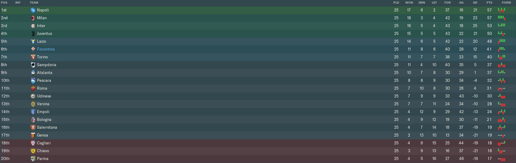 The championship lead changed hands again, with Napoli’s 2-0 reverse at Torino allowing Milan to overtake them by ending Juventus’ eight-match unbeaten league run. Juve subsequently conceded 3rd place to Inter, who put on a five-star display at Udinese.