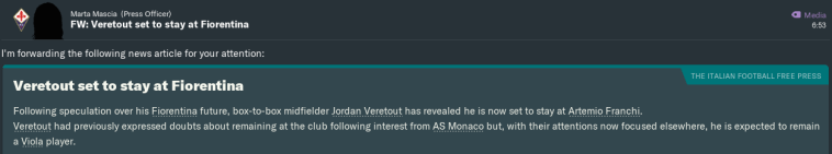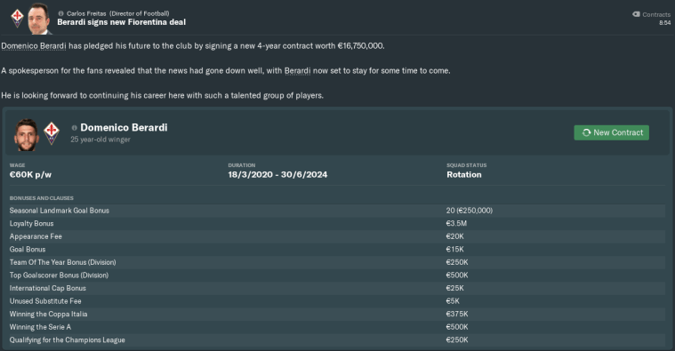 About a month ago, Berardi started asking me for a pay rise. I was initially reluctant to budge, as it’d not even been a year since he’d joined us from Sassuolo for €40,000 per week. This still seemed reasonable, as Domenico’s Viola career had thus far consisted of him scoring a load of penalties and not doing much else to justify the hype (which I guess made him our Mario Balotelli).