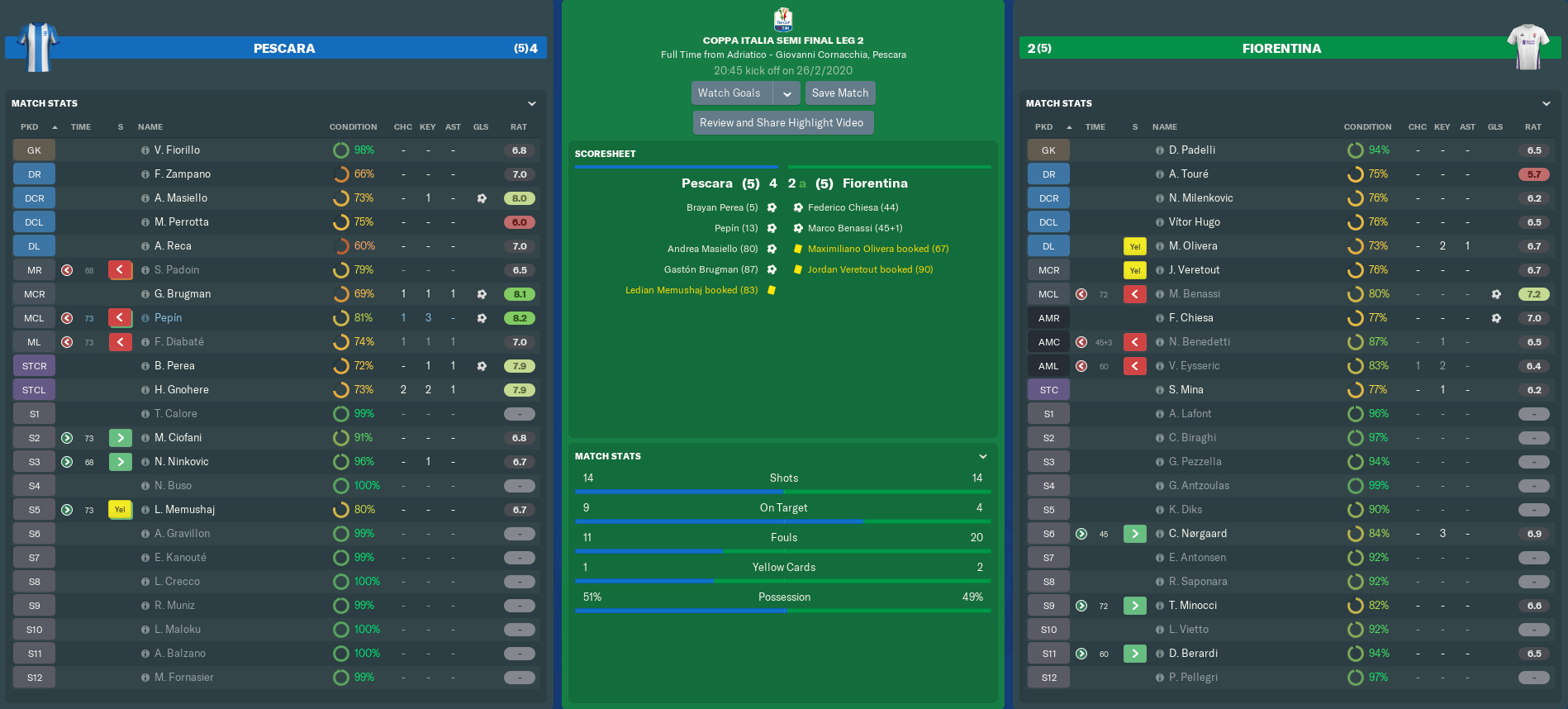 Our position was strengthened further in stoppage time. Olivera’s free-kick prompted some pinball in the Pescara box before Marco Benassi converted his first goal this term. That made it 2-2 on the night and 4-2 Fiorentina on aggregate, but now we had the edge on away goals. Unless we conceded THREE second-half goals, we could plan for the Final.