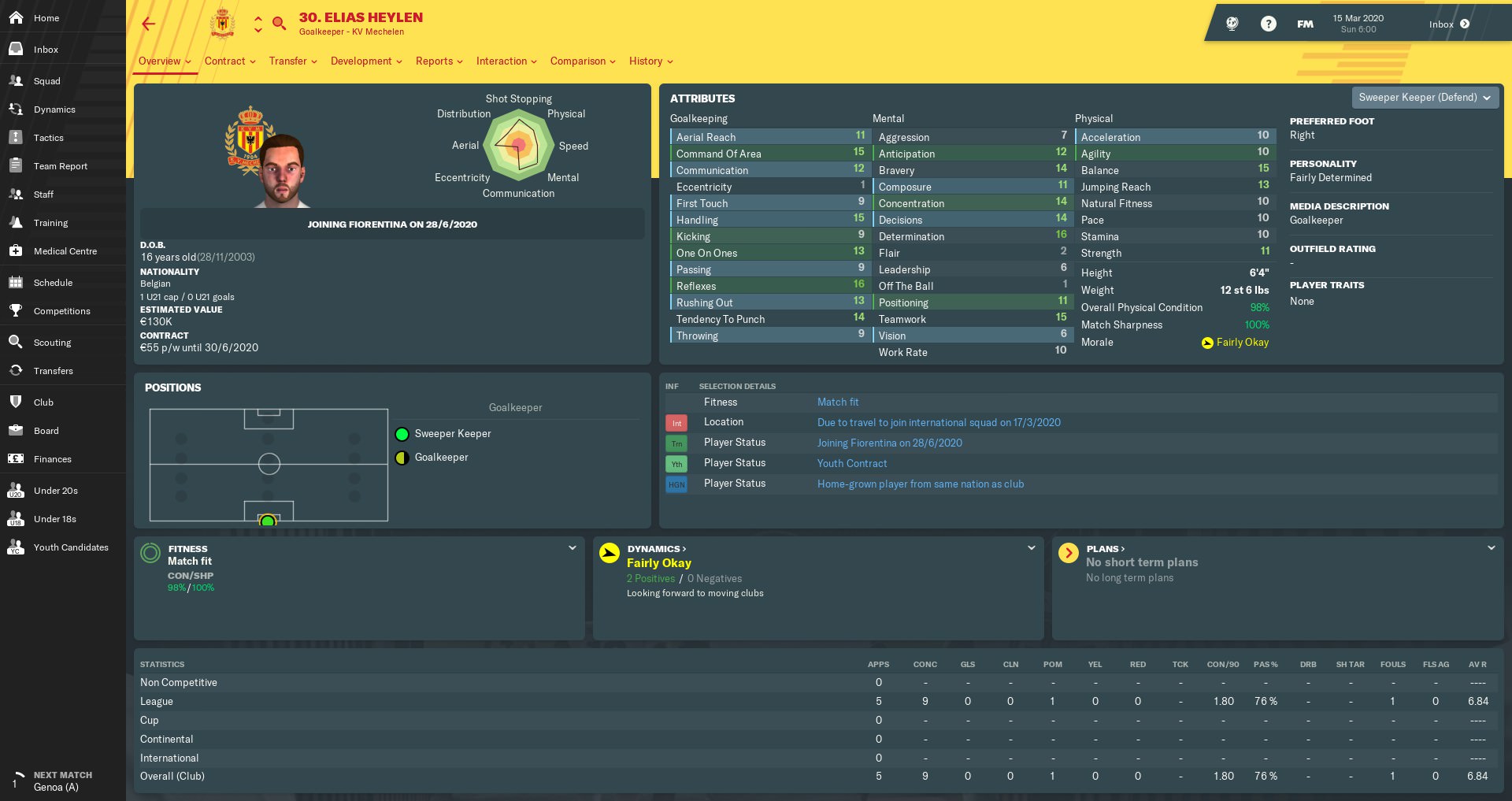 Even at 16, Elias Heylen has already had some career in his native Belgium. Despite starting out at second-tier Beerschot-Wilrijk, the tall goalkeeper was loaned out to Pro League side Mechelen, who’ve trusted him in a few league games. He also picked up an Under-21s cap for Belgium and caught the attention of one of my scouts.