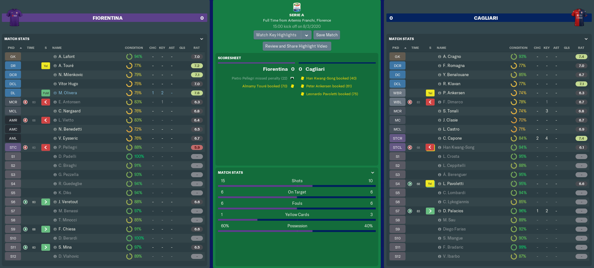 The half ended with a series of misses from Fiorentina midfielder Emil Antonsen. Neither he nor Pellegri was handling playing well, so both teenagers were subbed after a goalless opening hour. Their more established replacements Veretout and Santi Mina also proved ineffective at breaking Cagliari down, as did Chiesa when he came on for Vietto.