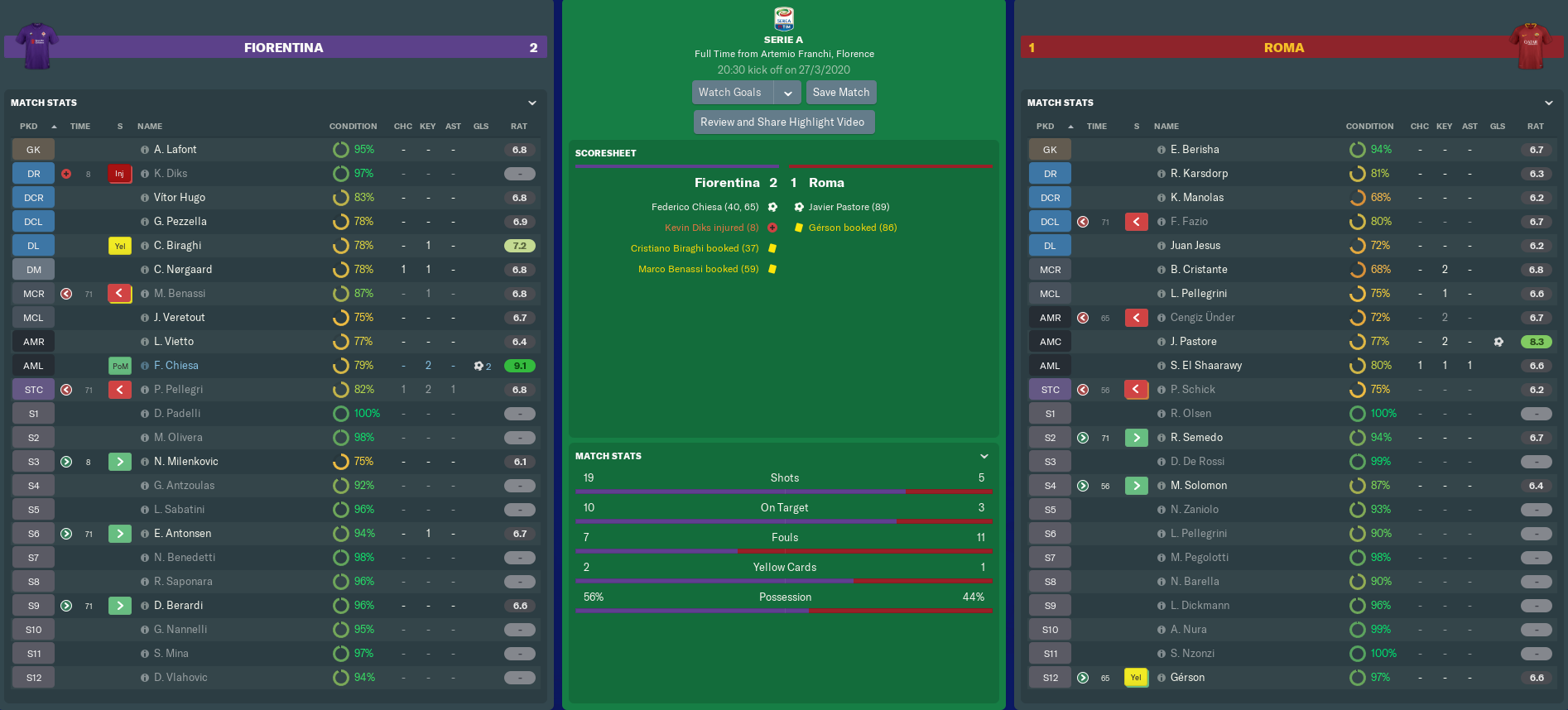 The matches keep coming thick and fast for my Fiorentina team. We’re still fighting on three fronts, but is it possible to reach the Coppa Italia Final, progress to the latter stages of the Europa League AND maintain a top-six placing in Serie A? With a squad that’s perhaps lacking depth?
