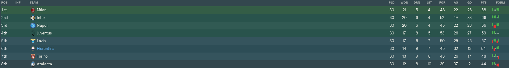Juve’s win gave them a sizeable lead on us in 4th place, while also boosting their hopes of a ninth straight scudetto. They were now four points adrift of new leaders Milan, whose 1-1 draw at Roma saw them overtake Napoli, who’d suffered their first home defeat against Lazio. Inter’s 2-0 victory over Pescara moved them within two points of top spot.