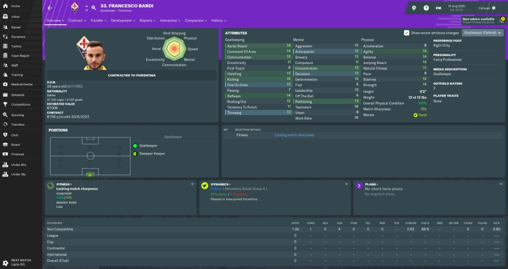 I needed someone who was cheap, relatively experienced, and preferably Italian to deputise for Lafont if need be. Francesco Bardi had spent a few seasons at Frosinone, and despite failing to take them back into Serie A last term, I felt the 28-year-old had enough about him to provide adequate cover. Bardi won 37 caps for Italy’s Under-21s in his younger days – a record he shares with a certain Andrea Pirlo.