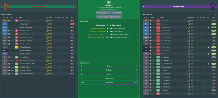 Local minnows Kepezspor were completely outplayed in the first half of our first friendly. Reserve striker Gori claimed his first senior goal for Fiorentina, either side of strikes from Pezzella and Domenico Berardi. We then eased off in the second period, though Ceccherini had just enough time to get one last goal in before his move to Verona.