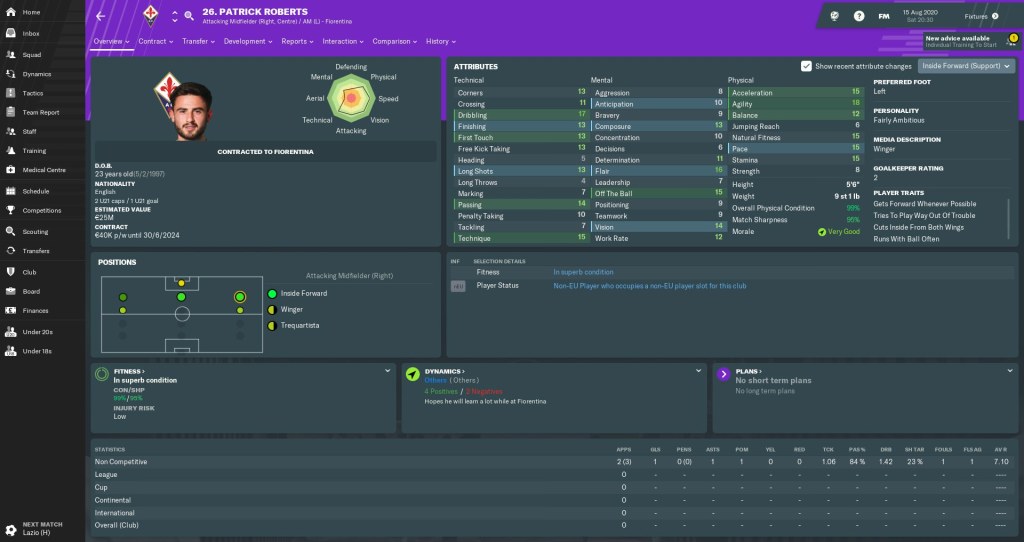 It’s about time I brought an English player to Florence, isn’t it? Patrick Roberts was available on a free after failing to break into Manchester City’s all-conquering team, but this agile left-footed, right-sided forward will get more opportunities here. Having previously managed the Londoner on FM17, I’m looking forward to some potential brilliance.