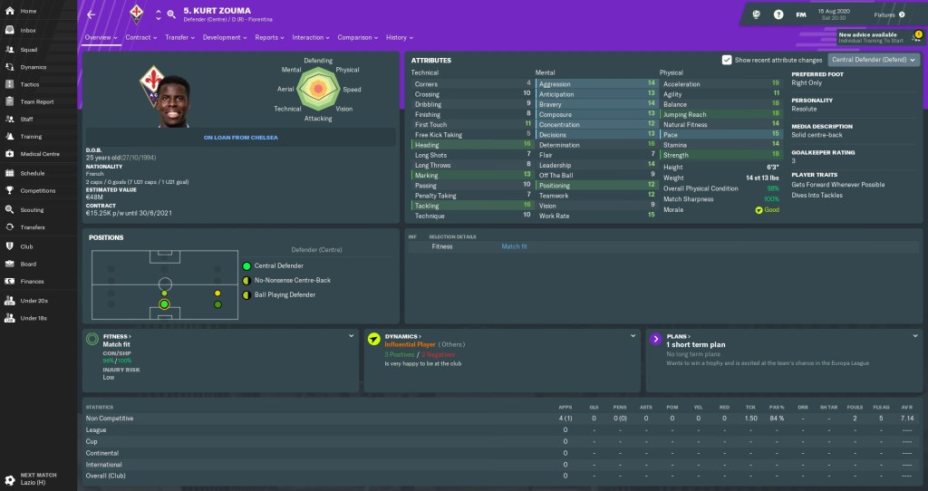 Big things were expected of the huge Kurt Zouma not that long ago, but his Chelsea career never really took off. After a season on the Stamford Bridge fringes, we lured him to Italy on a season-long loan, which I might try to make permanent if he impresses.