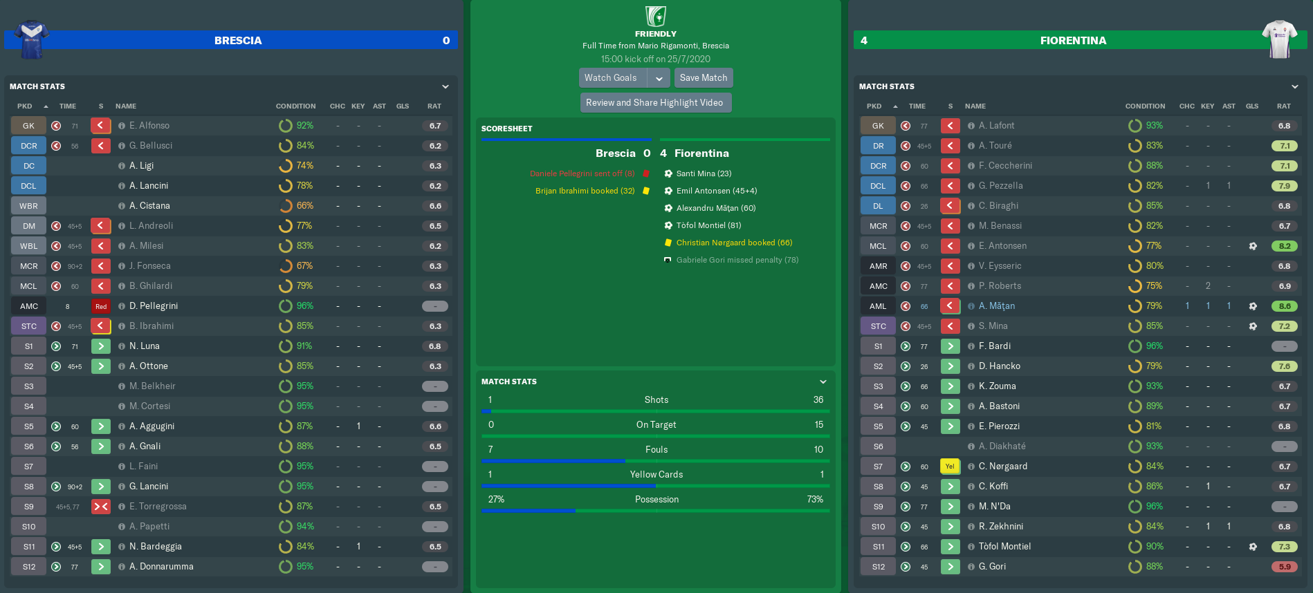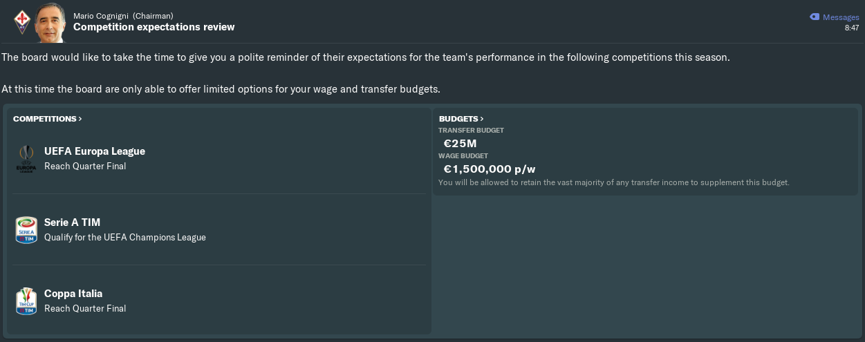 Then we come to Serie A. The board would have been content with yet another top-six finish, but I’m definitely not. As I’ve stated before, we must finish in the top four and qualify for the Champions League this season, or that’s it for me at the Franchi. The players are certainly determined to take that extra step, in the knowledge that they’ll receive substantial bonuses if they succeed.