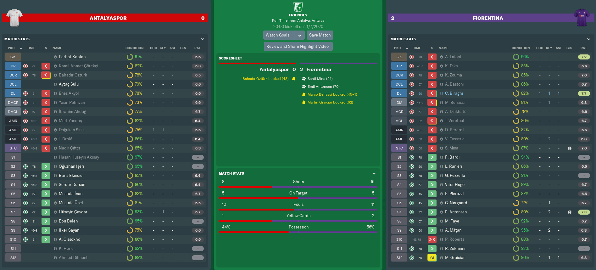 Local minnows Kepezspor were completely outplayed in the first half of our first friendly. Reserve striker Gori claimed his first senior goal for Fiorentina, either side of strikes from Pezzella and Domenico Berardi. We then eased off in the second period, though Ceccherini had just enough time to get one last goal in before his move to Verona.