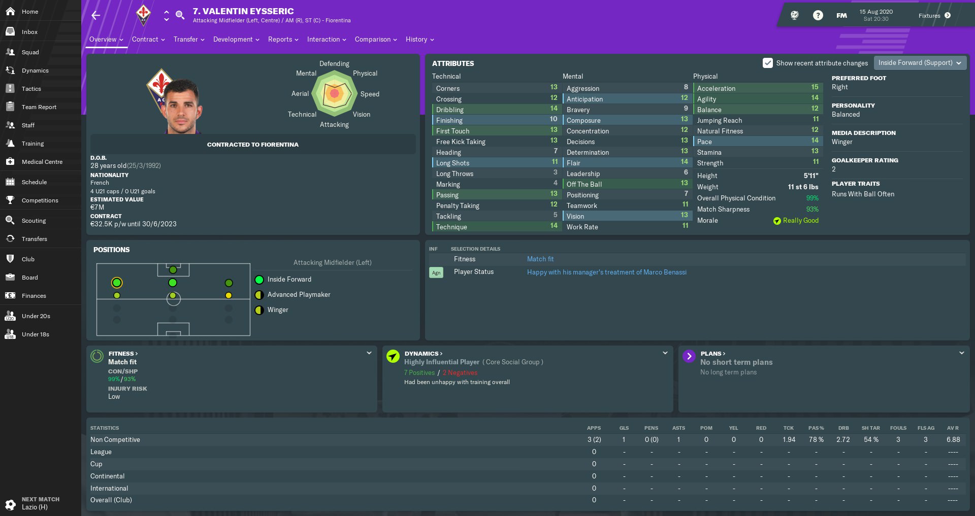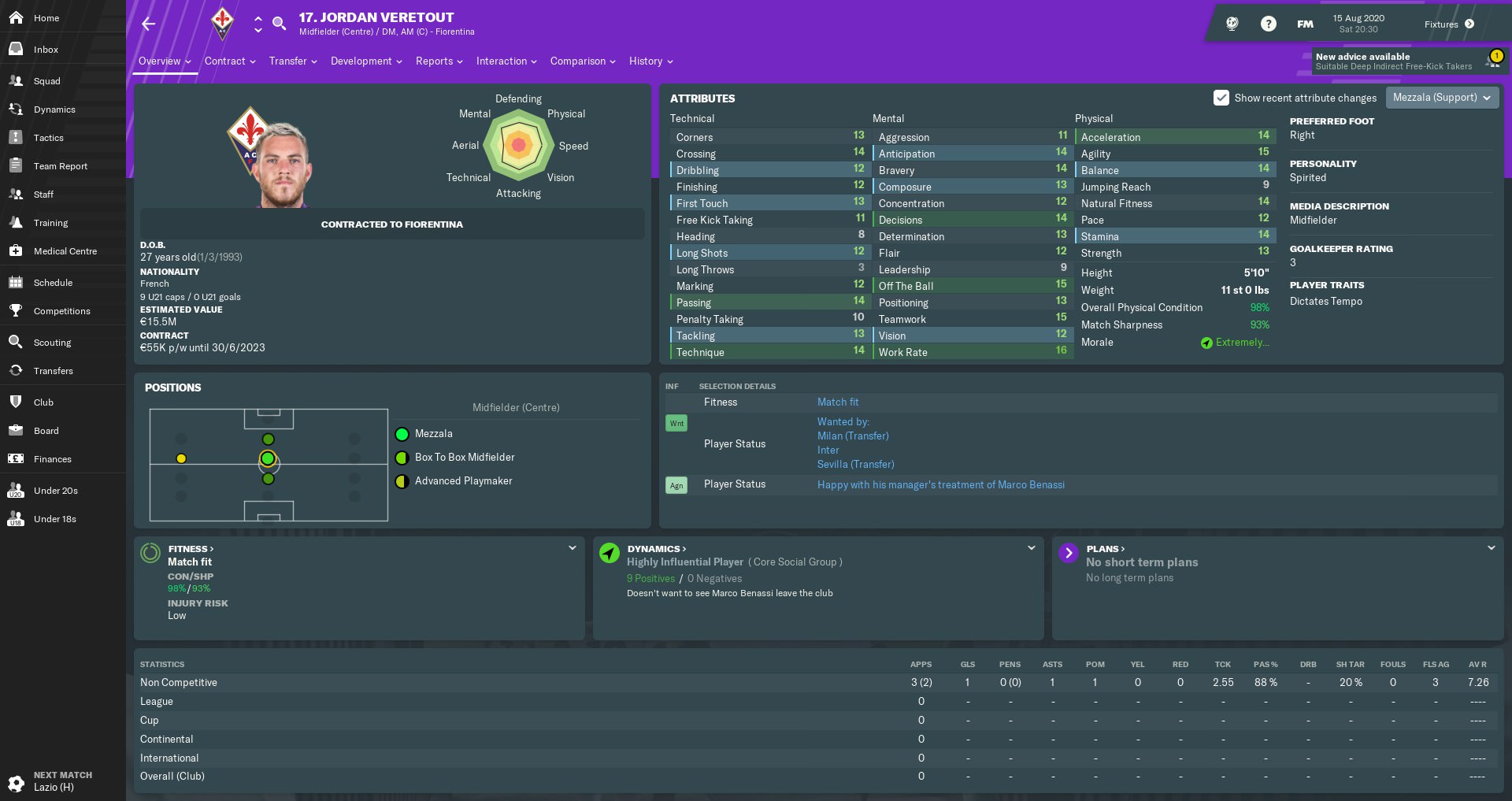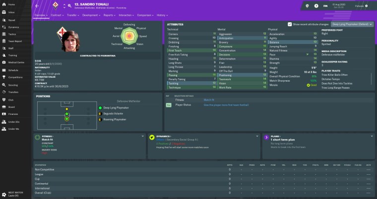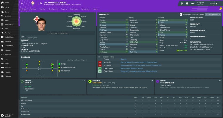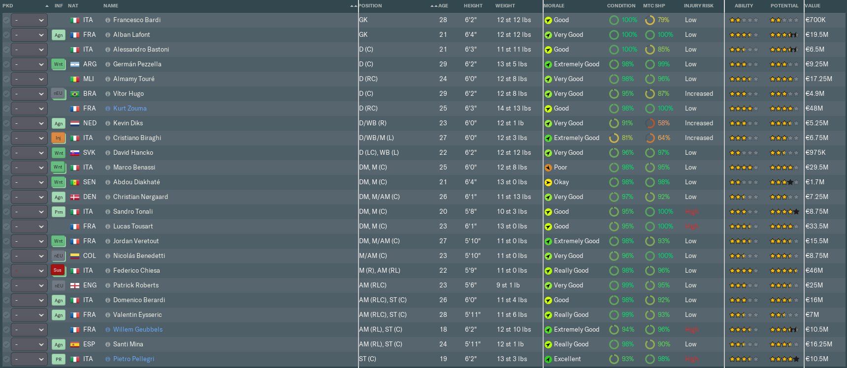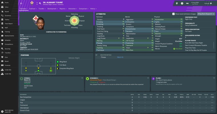 Almamy Touré made slow but steady progress in a promising first season at Fiorentina. The Malian wing-back’s energy and crossing ability always give us an extra dimension when attacking from the right flank. Touré was another player who’d caught the attention of other clubs, but I warded off any potential bids by handing him a new five-year contract.