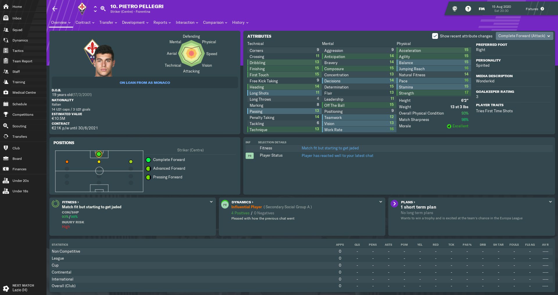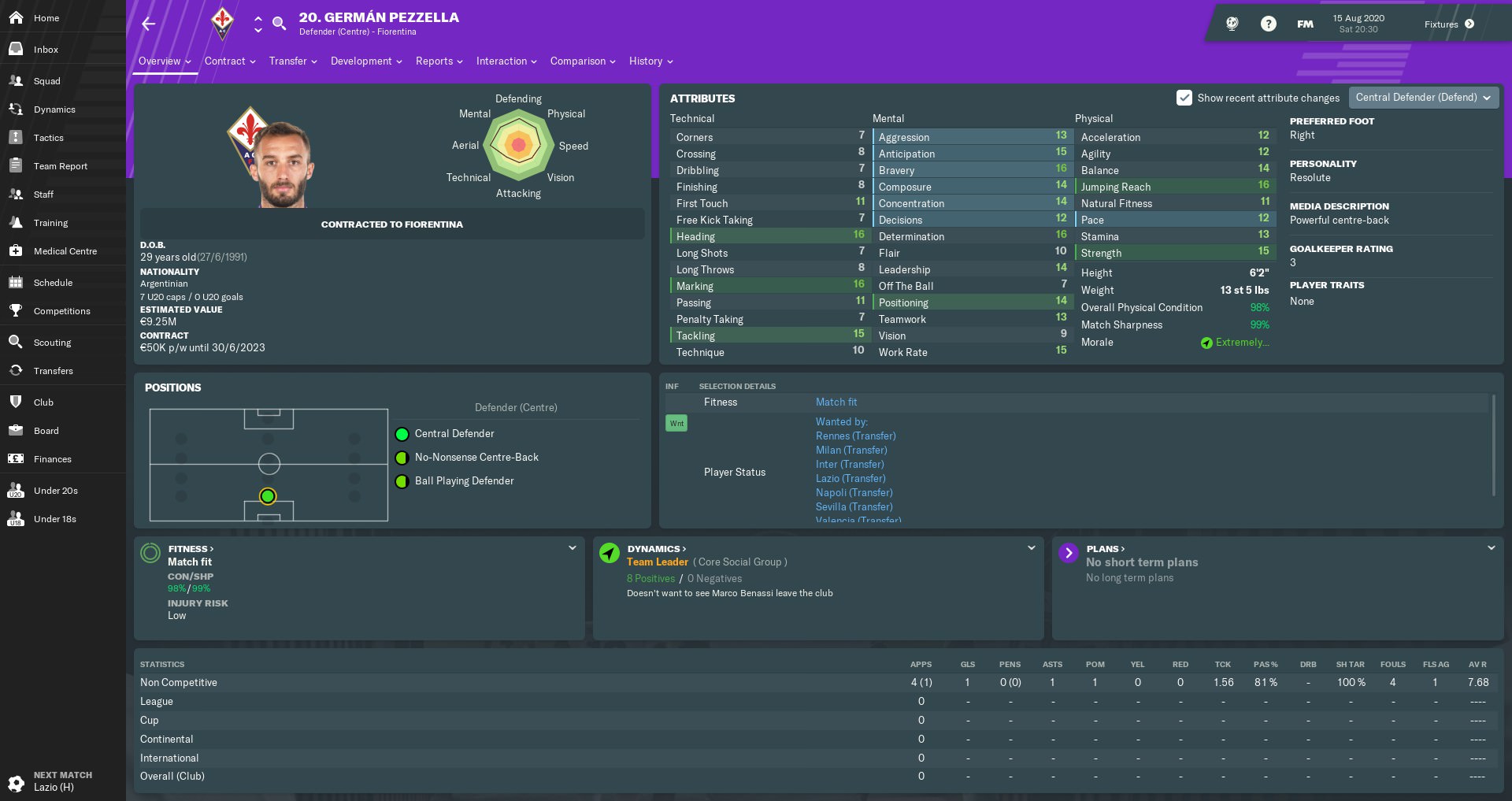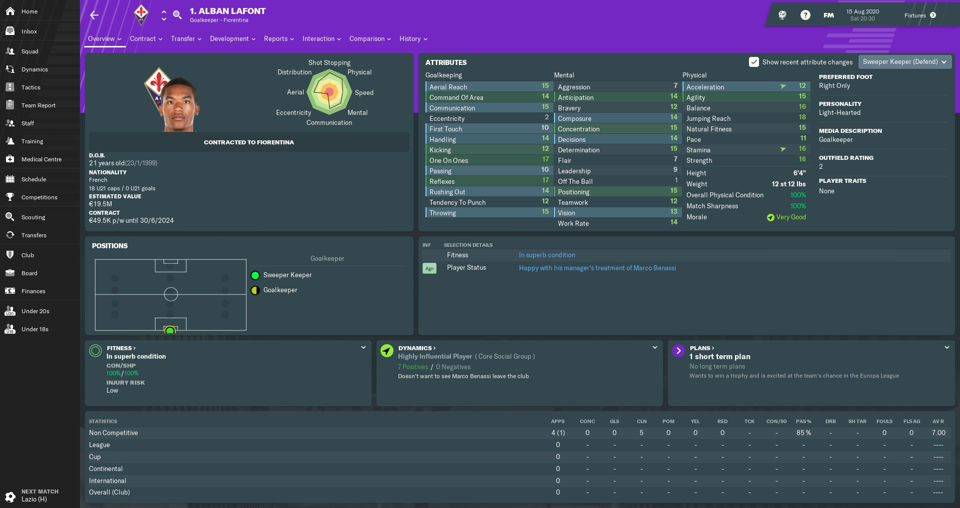 Almamy Touré made slow but steady progress in a promising first season at Fiorentina. The Malian wing-back’s energy and crossing ability always give us an extra dimension when attacking from the right flank. Touré was another player who’d caught the attention of other clubs, but I warded off any potential bids by handing him a new five-year contract.