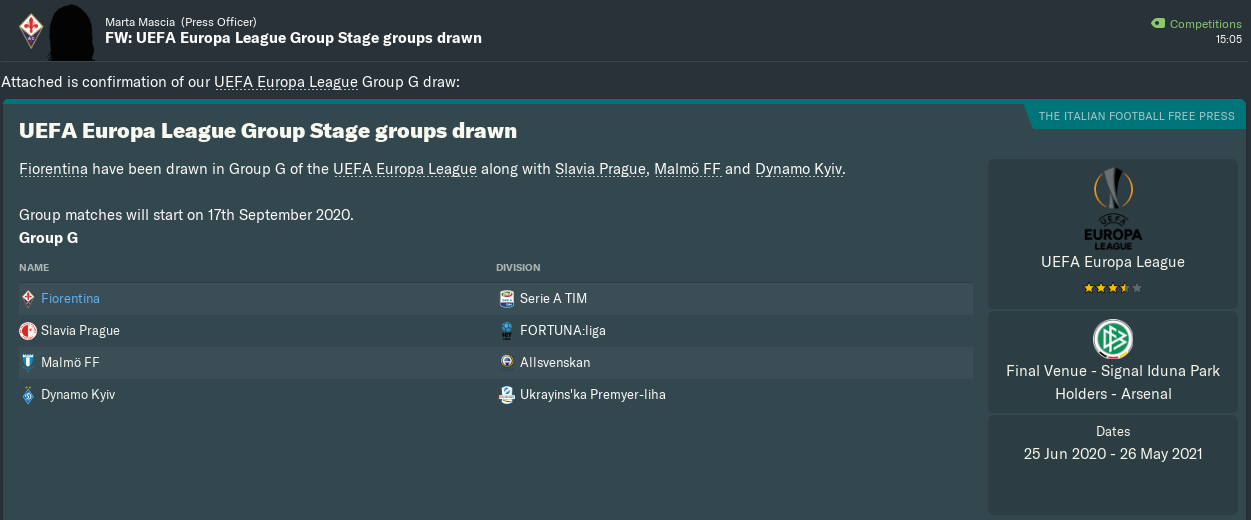 Despite being third seeds, Czech champions Slavia Prague were perhaps the weakest team in the pool. Looking through their squad, I couldn’t find anyone that I thought would cause us too many problems (in before their left-back scores a late winner at the Franchi to make me look like a right mug).