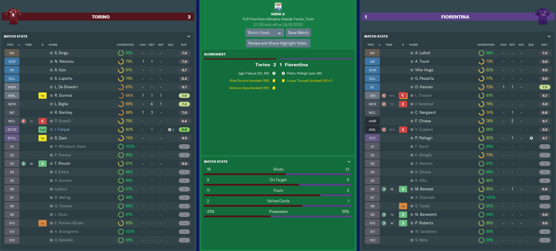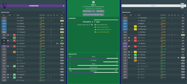Pellegri’s first game back in a Viola jersey soon became a nightmare, as a couple of equalising attempts failed to come off. The teenager fared so badly in the first period that I contemplated subbing him off at half-time. Instead, I decided to sacrifice Eysseric and Tousart – the latter of whom had been booked for an injury-time foul on Torino’s Ross Barkley.