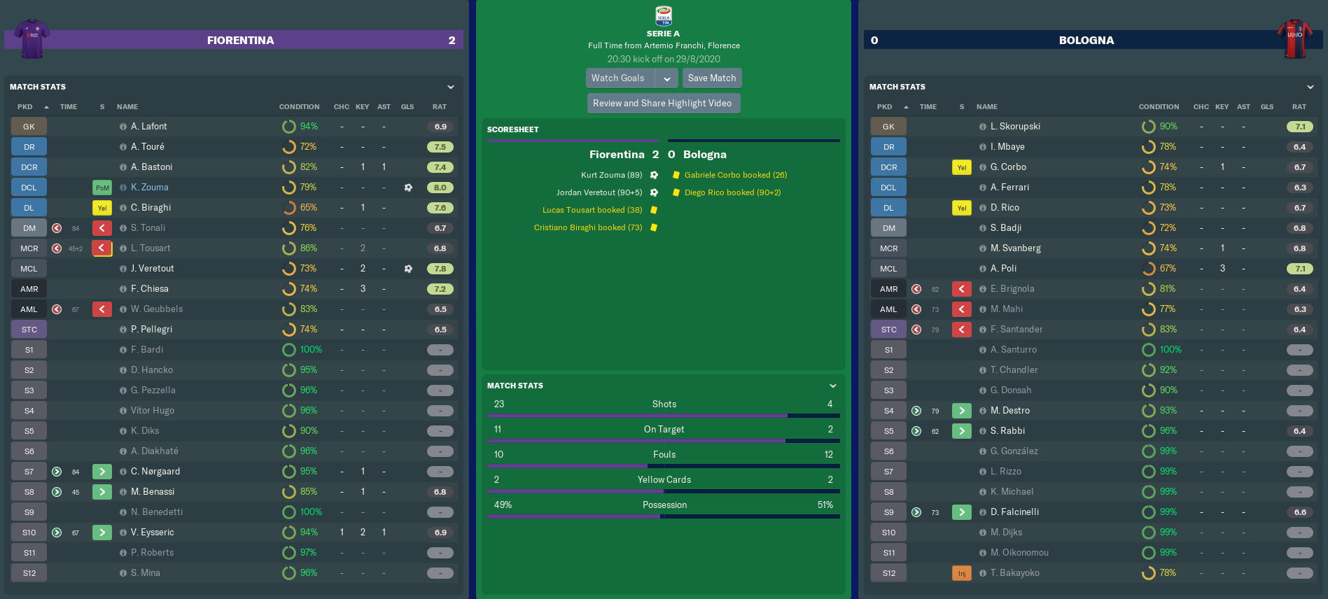 FIORENTINA vs BOLOGNA (Serie A, Match 3)