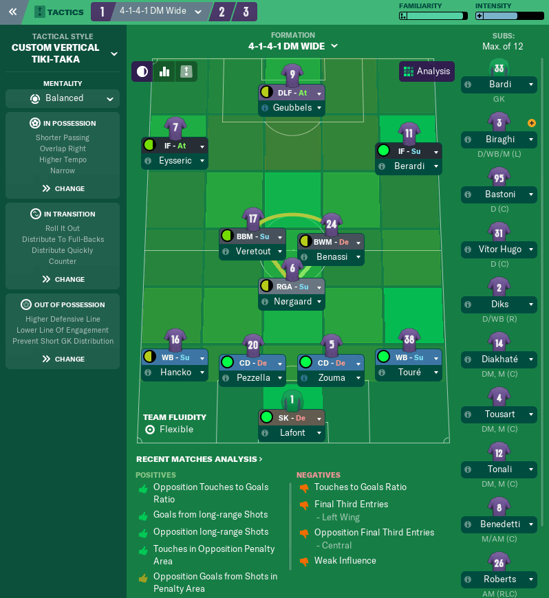 I will again be using ‘Fullerball’ as my primary tactic, especially at home. With a narrow attacking shape and a higher defensive line, but a lower line of engagement, we should be able to suffocate the opposition team and give them little space.