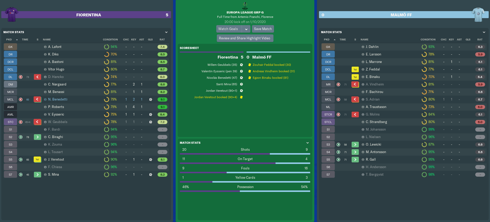 The Swedes tried to restore some respectability to the scoreline later on, but target man Carlos Strandberg hit the bar with his only shot in the 69th minute. More agony would be piled on them in injury time, as Jordan Veretout‘s 20-yard volley from a Nørgaard cross flew into the net. That rounded off an emphatic 5-0 victory – my biggest in a competitive match as Fiorentina boss!