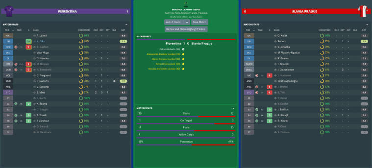 By the 27th minute, though, it was our other inside-forward who was celebrating. Roberts’ wait for his first competitive Fiorentina goal ended when he got the final touch to Mina’s header from an Eysseric corner. Slavia’s defending of their six-yard box was suspect to say the least, but nonetheless, we were 1-0 up.