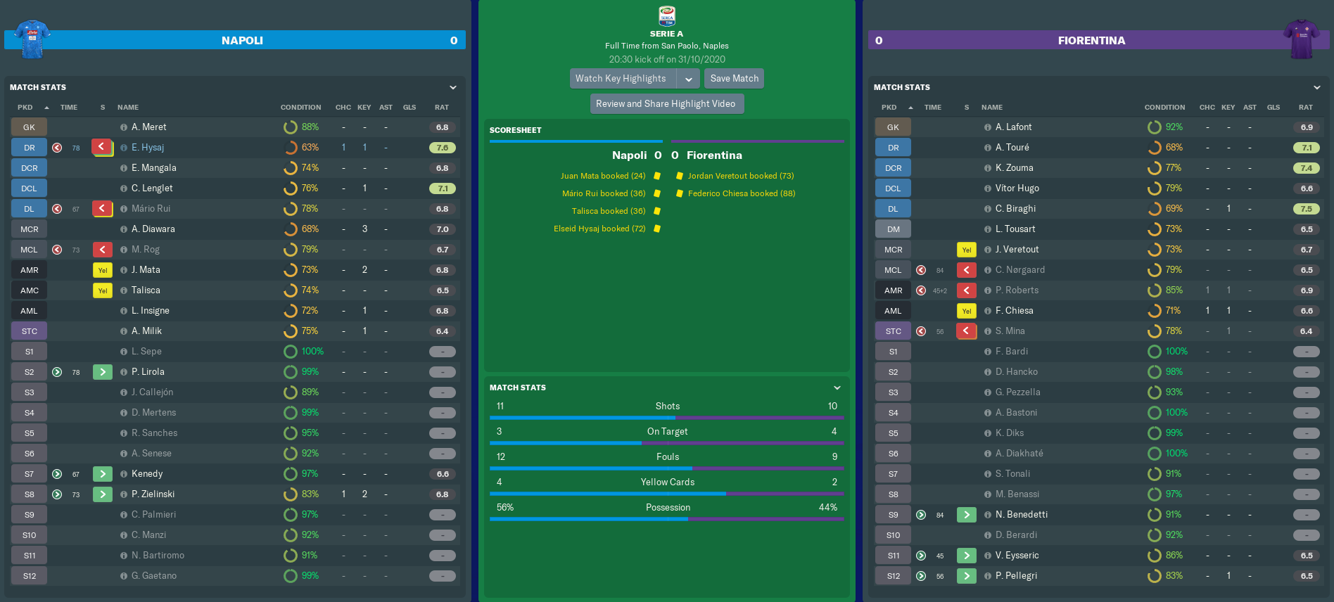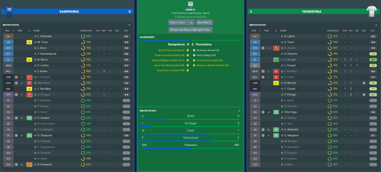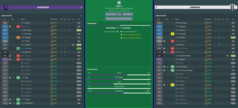 With 20 minutes to go, I went for the kill by bringing on Chiesa – who’d scored a hat-trick in this fixture last season – and Geubbels. Neither man could quite bring home the bacon (sorry… bagels), though Chiesa did trouble Szczesny in the 77th minute. After Bonucci had a late effort for Juve saved by Lafont, another great match between Fiorentina and Juventus finished level at 1-1.