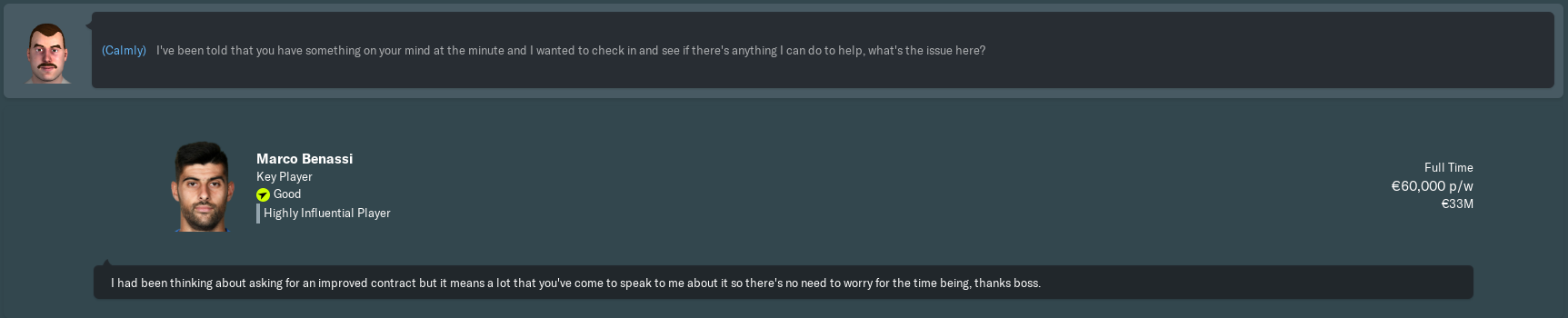 Benassi’s current contract runs until the end of next season. I’ll probably offer him fresh terms in the summer if he’s back in form and we’ve qualified for the Champions League. (Don’t tell Marco yet, though. Let’s keep this as our little secret for now. Got that? Brilliant.)