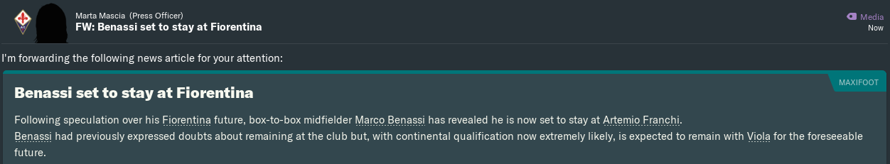 Well, I’m glad. Benassi is a fantastic all-round midfield talent and a major part of my long-term plans for Fiorentina. Let’s hope that we soon start to see Marco back to his best, because when his head’s screwed on, he’s a joy to watch.
