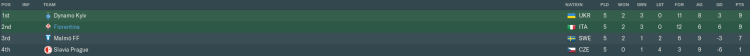 There were more fireworks in Sweden, where Dynamo Kyiv squandered a 2-0 lead in injury time and gifted Malmö a draw. That left us and Dynamo on eight points apiece, Malmö on four, and Slavia eliminated on one. The top two would meet at the Artemio Franchi three weeks later, and whoever won that would secure 1st place in Group G.