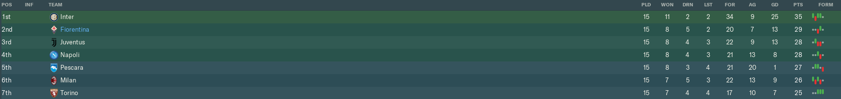 Incredibly, Biraghi’s goal saw us vault over three teams into 2nd. That was because Juventus had lost 1-0 to Inter (who now had a six-point lead), Napoli had conceded an 89th-minute winner against Atalanta, and Pescara had drawn 1-1 at Udinese. The Bianconeri, Partenopei and Delfini were all behind us by a single point now.