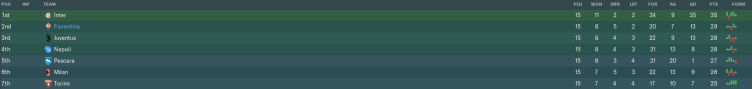 Strangely, that slip-up didn’t do any real damage to our league position. Three other teams in the top five had drawn as well, with Inter and Napoli becoming locked in a stalemate before Juventus failed to kill Genoa off. The big losers were Pescara, whose 3-1 home defeat against Roma saw them cede 4th spot to Napoli.