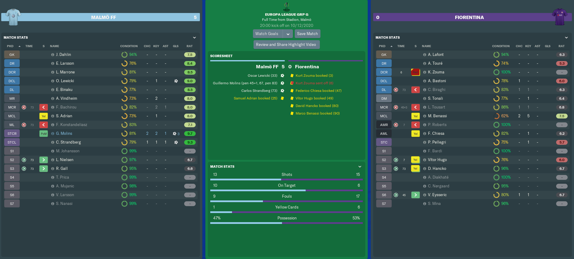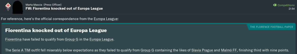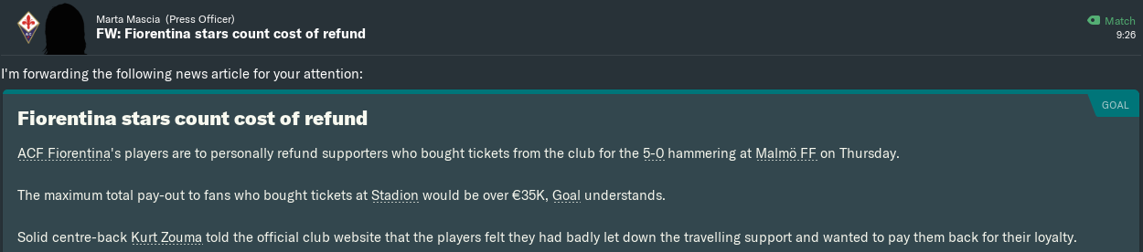 Back in FM13, my Romford team led Bromley 2-0 after the first leg of the Conference South Play-Off Semi Finals. We went 5-1 down at half-time in the second leg, before ultimately losing 7-3 and going out 7-5 on aggregate. At least those Boro boys showed more guts and discipline than these Viola flowers did in Sweden!